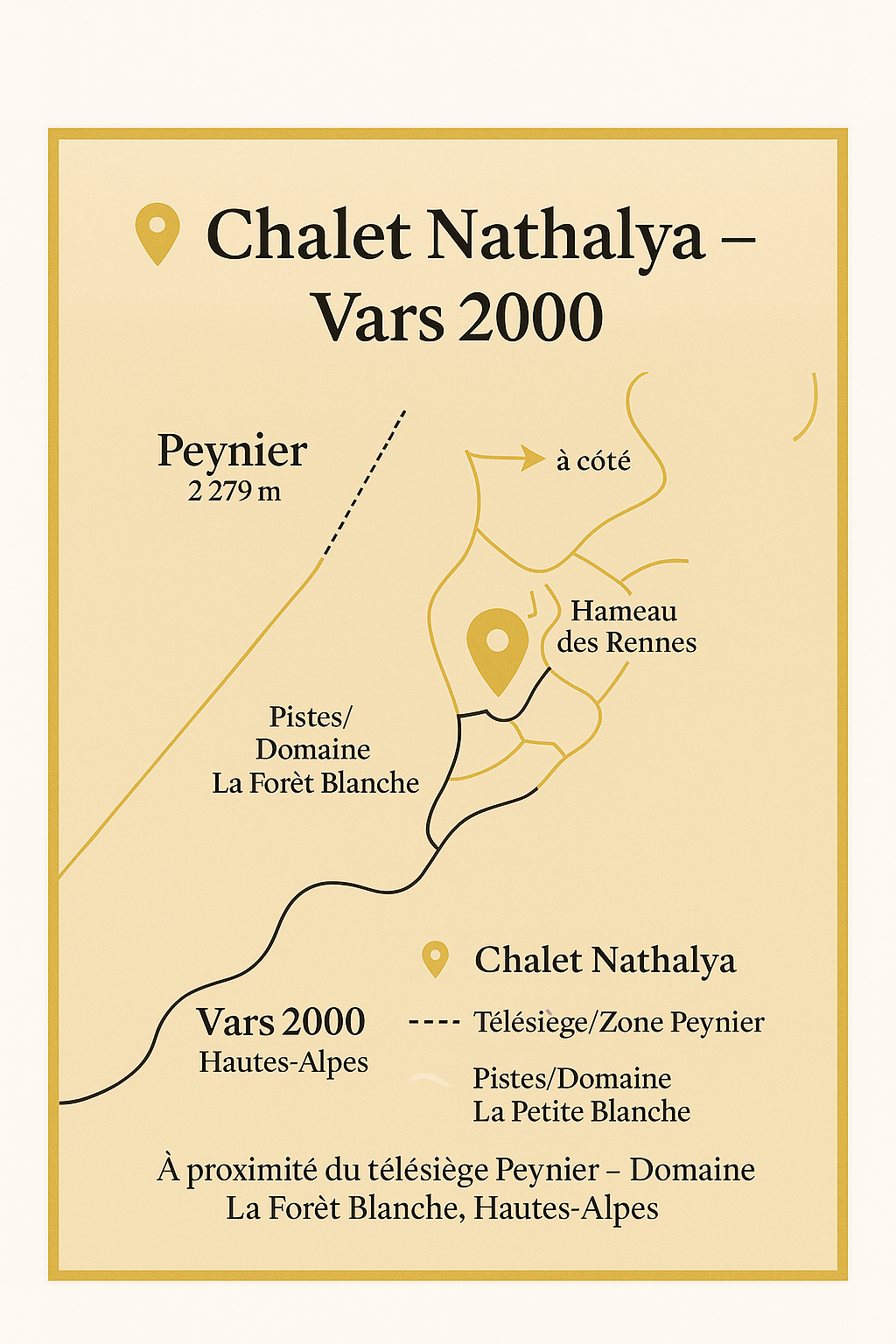 Le Chalet Nathalya se situe dans le quartier Fontbonne / Hameau des Rennes, à Vars 2000, l’un des hameaux les plus calmes et les plus hauts de la station (altitude env. 1 950 m).