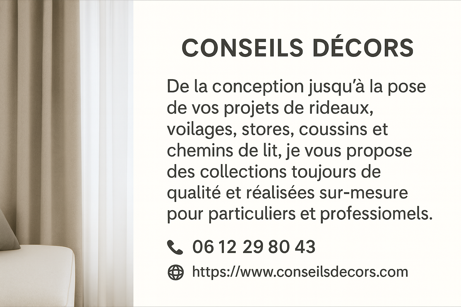 Entreprise de rideaux & décoration : experts dans la confection et la pose de rideaux, voilages et stores sur-mesure, pour sublimer chaque intérieur avec élégance.